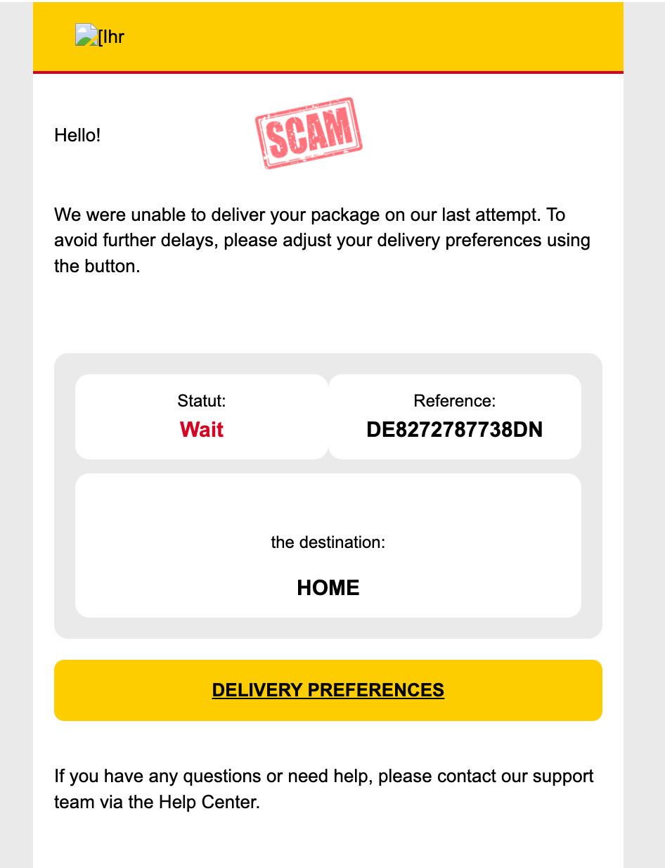 If you receive an email claiming DHL could not deliver a package and asking you to click a button, do not click it. These emails are scams designed to steal personal information or payment details, or to install malware on your device.