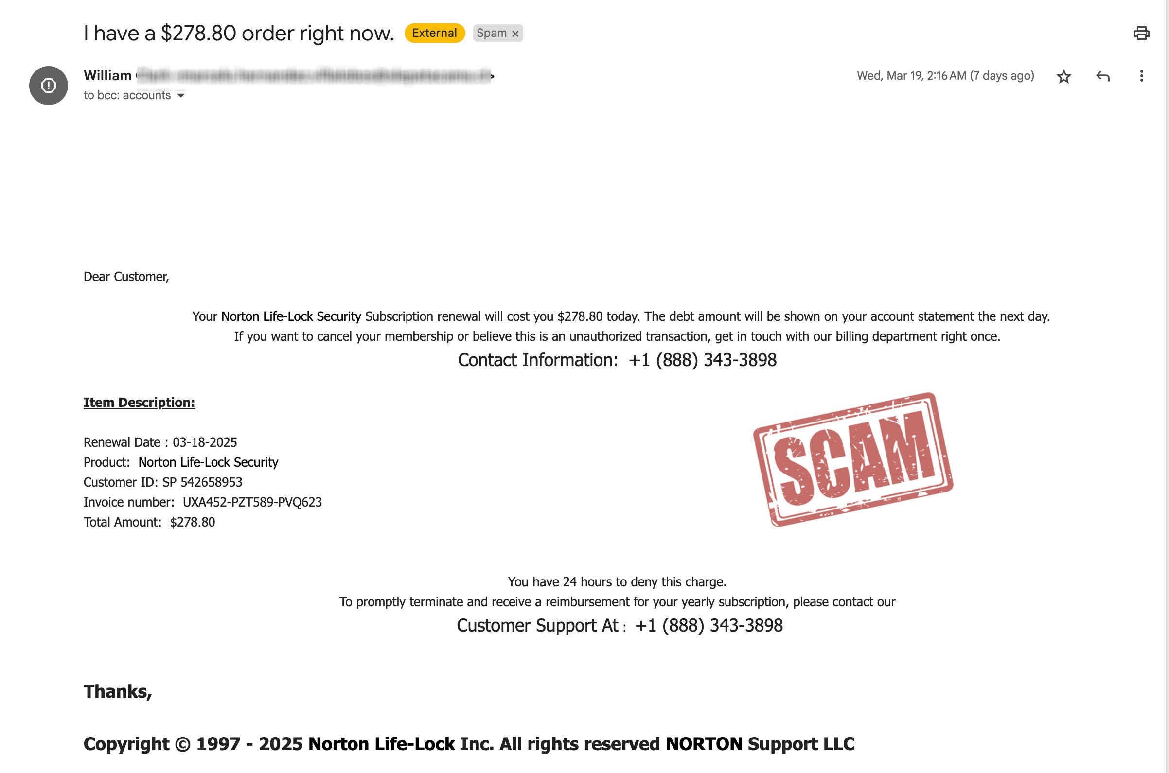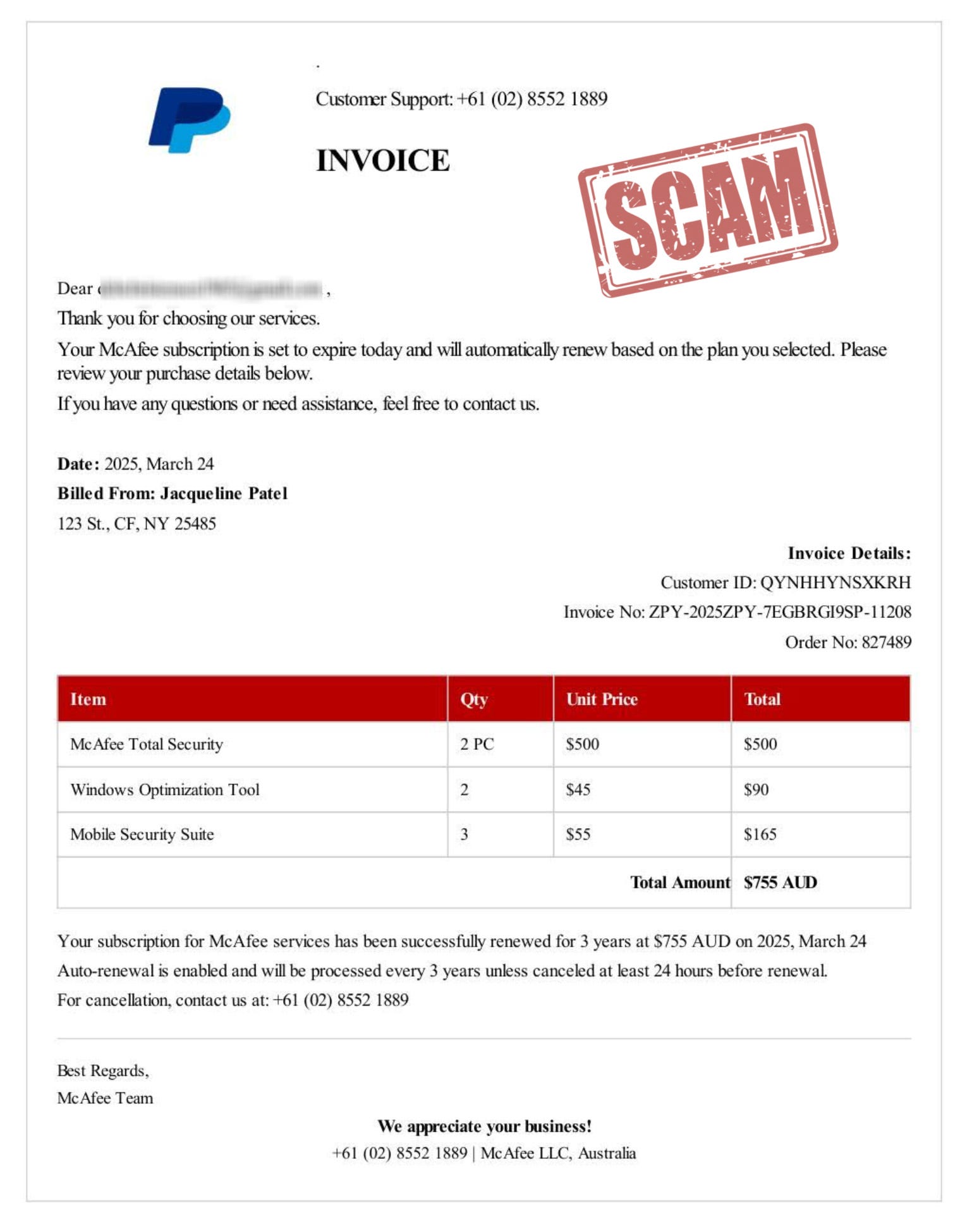 You receive an email claiming that the yearly subscription to a computer security program such as Norton or McAfee is set to renew. The email appears to be an invoice for the charge and may include company branding and other details designed to make it appear genuine.